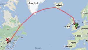Fortunately, there's a whole lot of land bordering the Atlantic Ocean, and so rather than fly from London to New York directly you have to go via Scotland, Iceland, Greenland and Canada, rather like this: