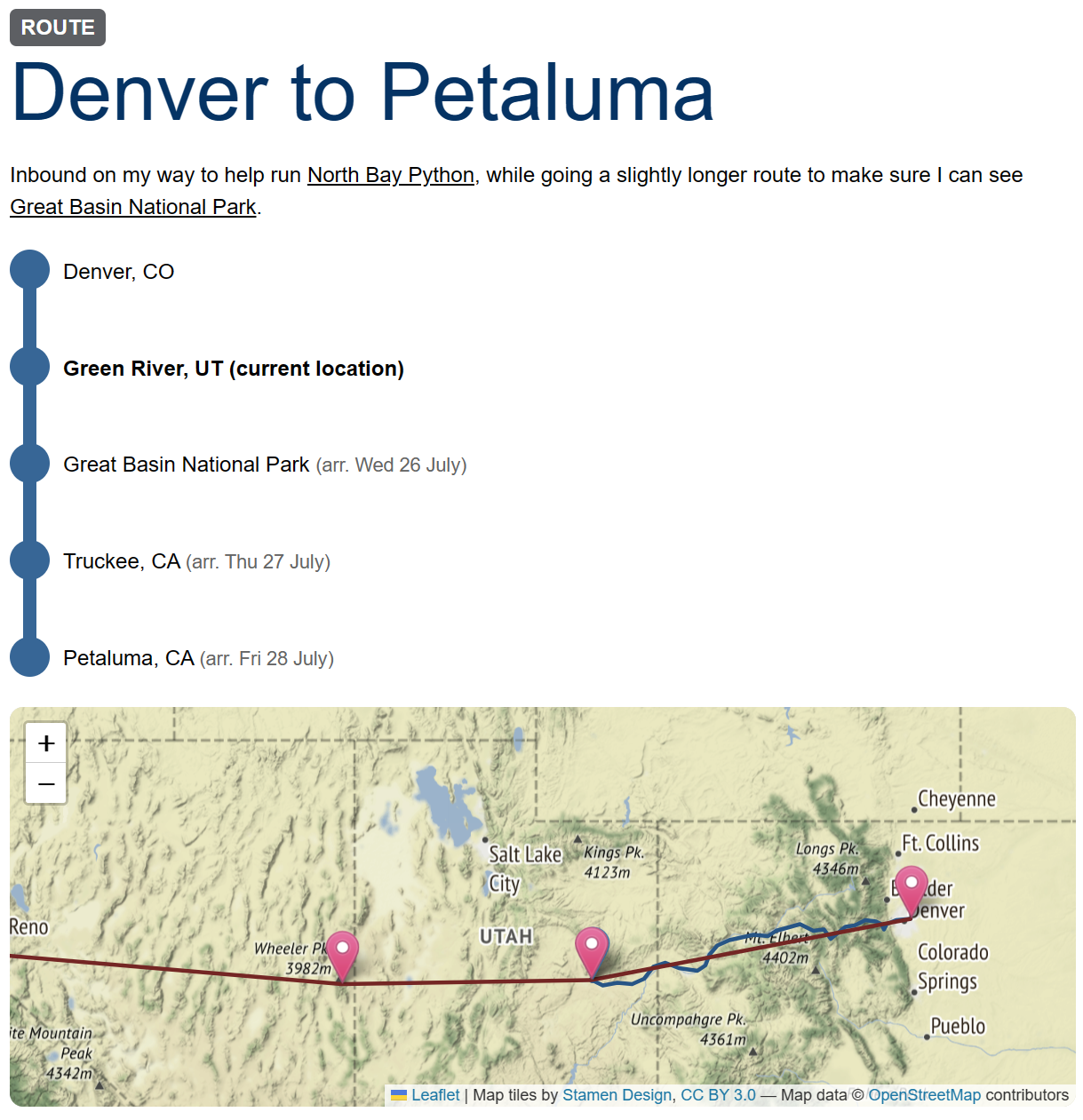 It's not particularly complicated, but I built it in two nights before the trip I'm currently on - from Denver to the San Francisco Bay Area (for North Bay Python) - and it seems to be working well so far, and it's a useful little tool to show people where I am on this journey.
